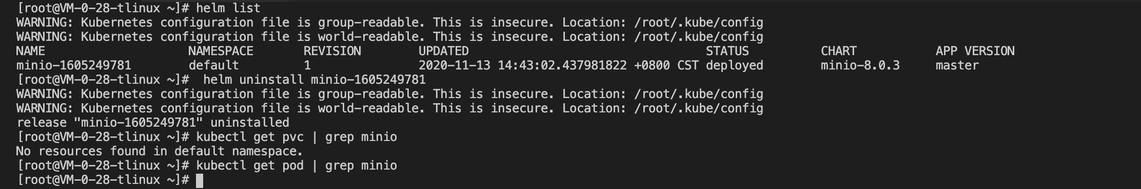 At this point delete all of MinIO’s resources, including its PVC persistence volume, as shown below::