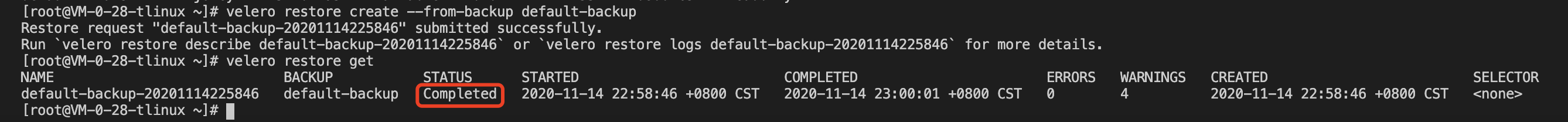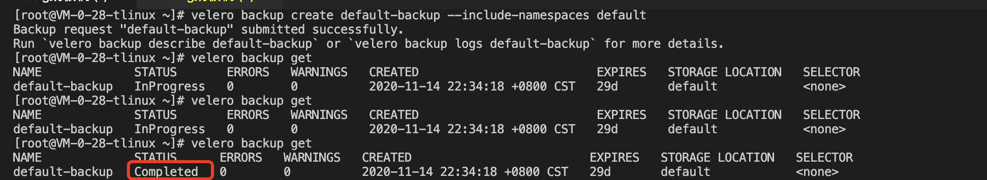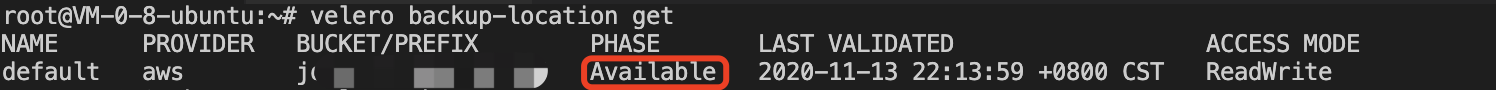 When the restore is complete, don’t forget to restore the backup storage location to read and write mode so that the next backup task can be used successfully: