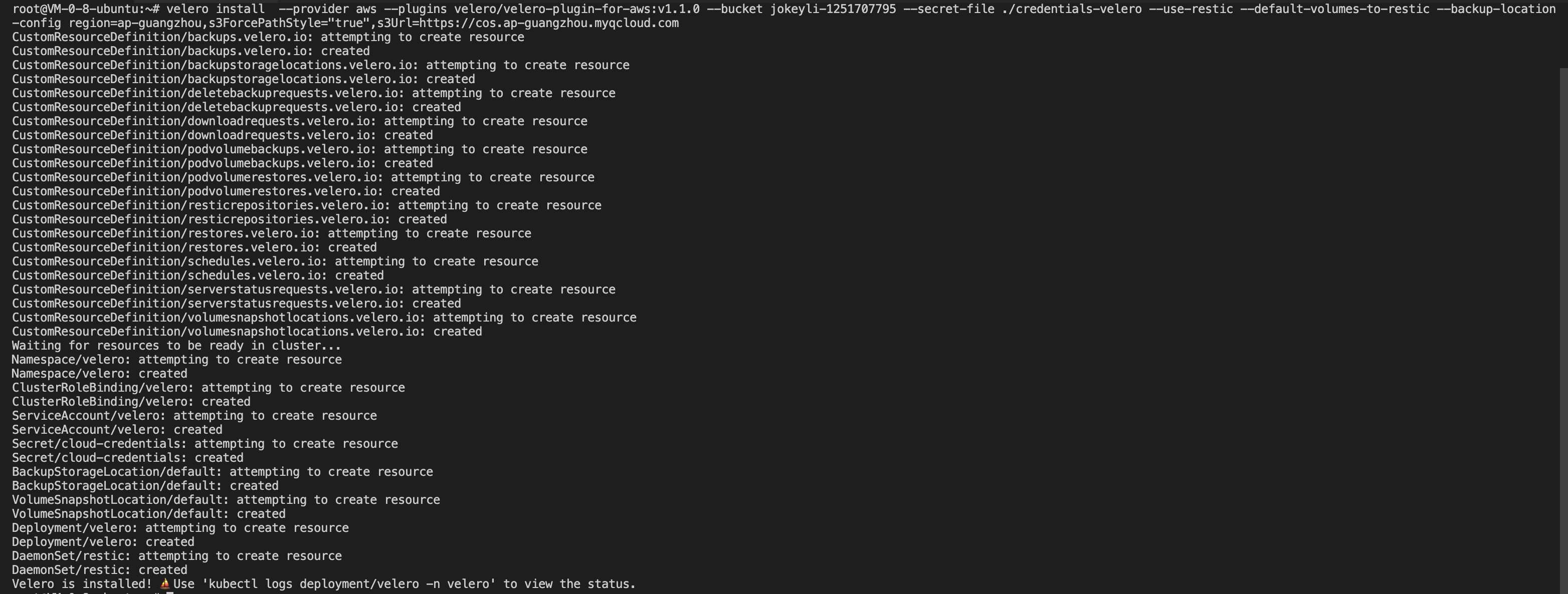 Follow the Velero installation command below to create velero and restic workloads and other necessary resource objects.
